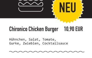 Neu im Programm: Chironico Chicken Burger mit Hühnchen, Salat, Tomate, Gurke, Zwiebeln, Cocktailsauce für 10,90€ Ebenso der Chicken Salat, der Salat „Bella Vista“ plus extra Hühnchen-Streifen für 14,40€. Lasst es [ … ]